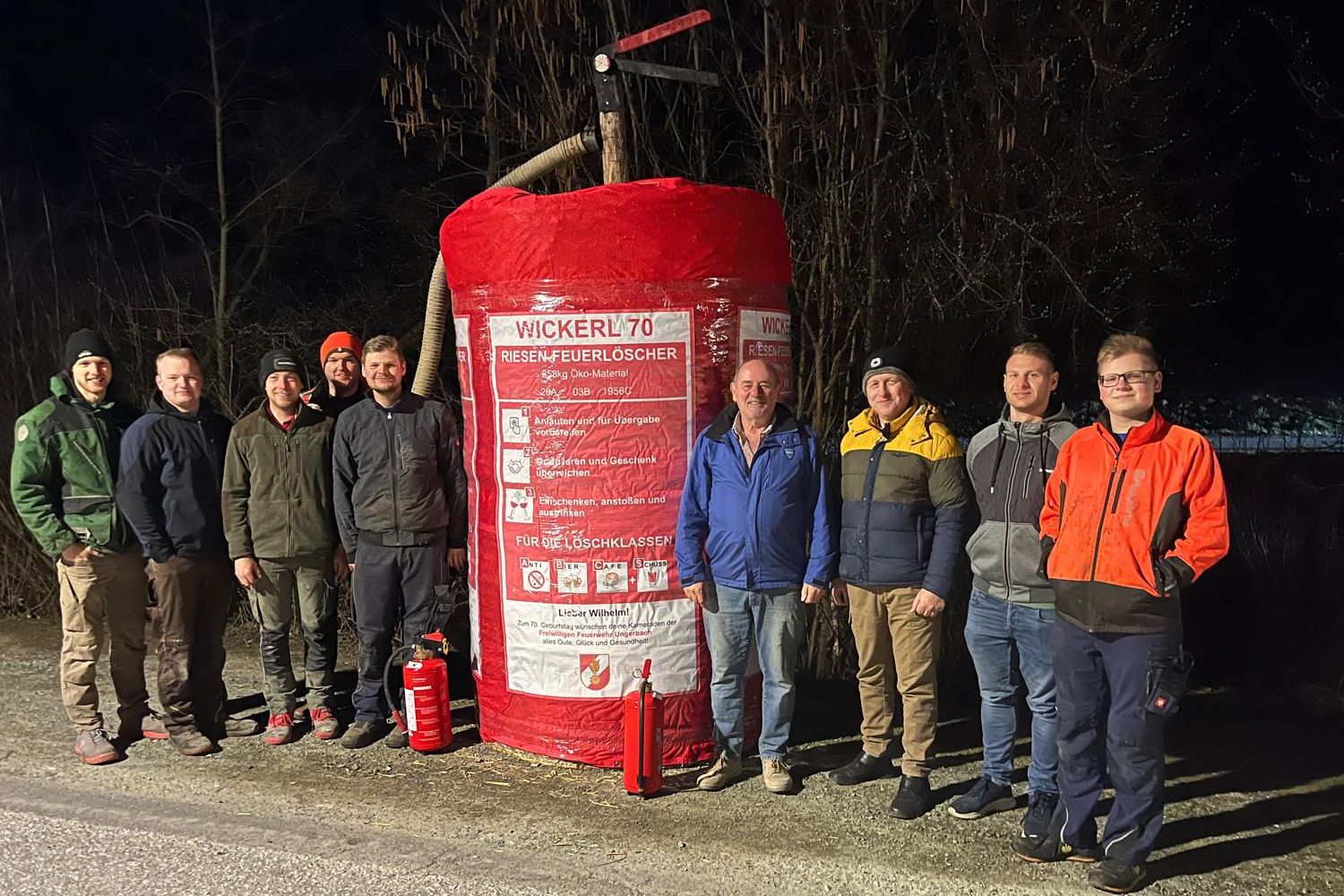 Zu diesem Anlass wurde ihm von seinen Kameraden der FF Ungerbach ein "Riesen-Feuerlöscher" vor das Haus gestellt.